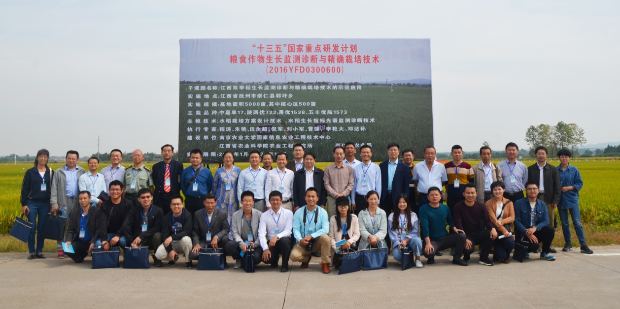 10月13日,由我校牵头承担的国家重点研发计划项目“粮食作物生长监测诊断与精确栽培技术”,在江西崇仁举行双季稻精确栽培技术现场观摩会。现场会由南京农业大学和江西省农业科学院农业工程研究所联合举办。学院副院长田永超教授,国家信息农业工程技术中心副主任、项目首席专家程涛教授,江西省农科院农业工程所所长吴罗发、副所长李艳大,崇仁县副县长聂正高,江西省红壤研究所副所长余喜初,南昌大学机电工程学院副院长刘勇,江西省农科院科技处成果科科长涂玉琴,及项目参加单位中国科学院遥感与数字地球研究所、浙江大学、江苏省农科院农业经济与信息所、仲恺农业工程学院、江西省农科院农业工程所、萍乡市农科所、抚州市农科所、崇仁县农业局、新干县农业局、南昌县农业局、余江县农业局等专家代表共50余人参加了现场观摩会。