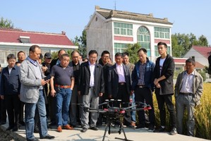 与会领导和专家现场考察了基地水稻优质新品种展示区、水稻精确栽培新技术新装备示范区以及创新试验区的实施情况,水稻智能生产创新团队还现场演示了手持式、无人机载式作物生长监测装备的使用方法。农技人员和大户们对这些新装备表现出浓厚的兴趣,积极了解作物生长监测仪用于看苗诊断和精确追肥的操作流程。
