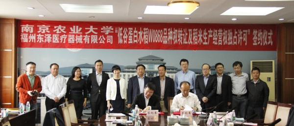 4月22日下午,“低谷蛋白水稻W0868品种权转让及稻米生产经营权独占许可”科技成果转让签约仪式在我校行政楼A613会议室举行。我校党委书记左惟、校长周光宏,中国农业科学院副院长万建民,北京大学现代日本人妻av 院长邓兴旺(美国科学院院士),我校副校长丁艳锋,福州东泽医疗器械(集团)有限公司董事长周少文、副总经理王芳等四人,中国东方资产管理公司、江苏大丰华丰种业股份有限公司、江苏盐城农科院等单位的领导和专家出席会议。科研院副院长俞建飞主持会议。